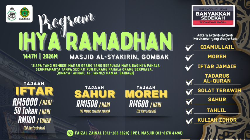 Di sini, Masjid Al-Syakirin mengajak anda untuk turut serta menyemarakkan Tabung Ihya Ramadan Masjid Al-Syakirin 1447H.